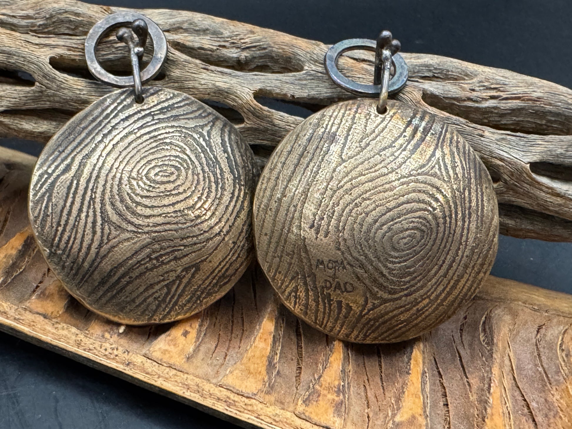 These beautiful Urns were made for a special friend and his brother. They contain the ashes of their Mom and Dad. They are the perfect size to carry in their pockets. The texture represents the rings of a tree and carved in it is Mom & Dad. These urns are hand carved and made with much care and precision.
