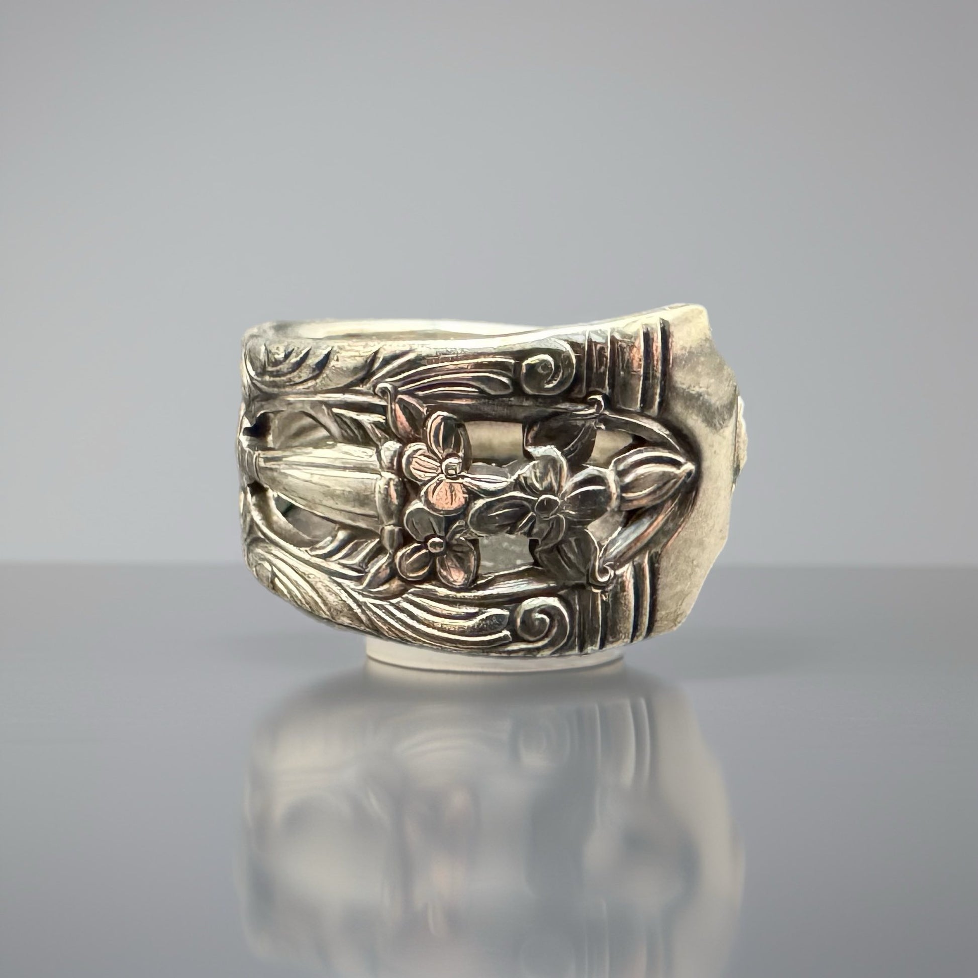 1937 Wallace "Filigree" Silver Plate Spoon Ring ~ This design features an ornate cut out handle with floral and scroll motifs.